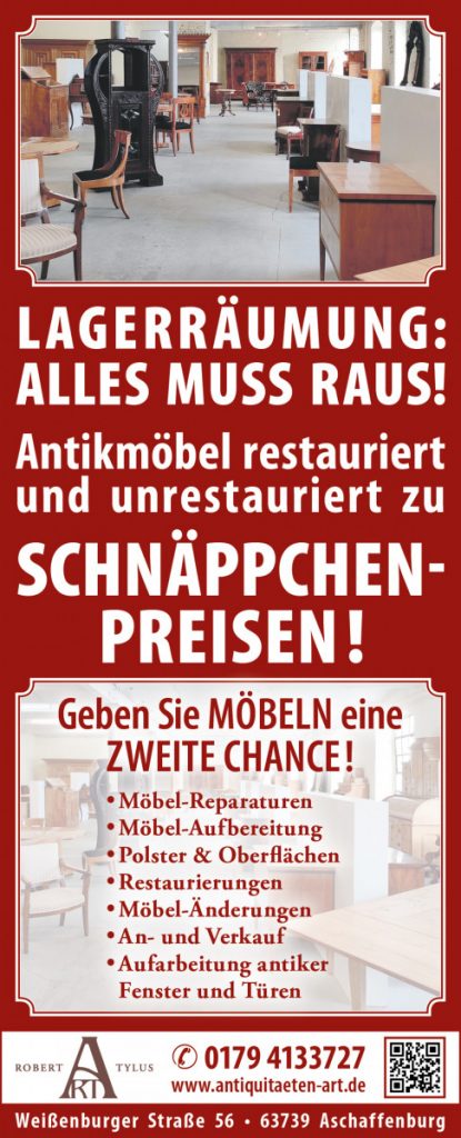 Heute kann Robert Tylus aus einem Erfahrungsschatz von mehr als 20 Jahren als Restaurator und Händler von Antik-Möbeln schöpfen. Als ausgezeichneter Fachmann auf diesem Gebiet steht er Ihnen mit Rat und Tat zur Seite, wenn es um Kauf, Verkauf oder die Restaurierung von Antik-Möbeln geht. Gerne ändert Robert Tylus auch Ihre Möbel, um sie ganz Ihren persönlichen Wünschen und Bedürfnissen anzupassen. Und das stets mit Liebe zum Detail, fachgerecht und professionell nach alter Handwerkskunst.